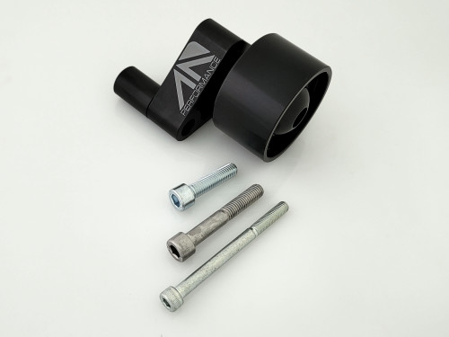 This billet aluminum adjustable idler pulley for the Hellcat, Demon, Redeye, Trackhawk, TRX, and Hellcat Durango platform is just what your supercharged 6.2L needs. The factory belt routing leaves lots of opportunity for belt slip, because of the lack of belt wrap on the supercharger snout pulley. While we designed this to also work with factory pulleys, the adjustable idler is an essential upgrade for anyone changing the upper or lower pulley for higher boost levels. We used a fixed adjustable design, with several different mounting holes for the idler to give you just the location you want, without having the weakness inherent in a bracket design with a large slot in it. This was also designed to be compatible with the AAD catch can bracket, and is compatible with the Billet Technology brackets as well (BT Brackets fit with very slight modification, no modification on the next batch) This pulley provides at least another inch of belt wrap around the upper pulley in the highest position.