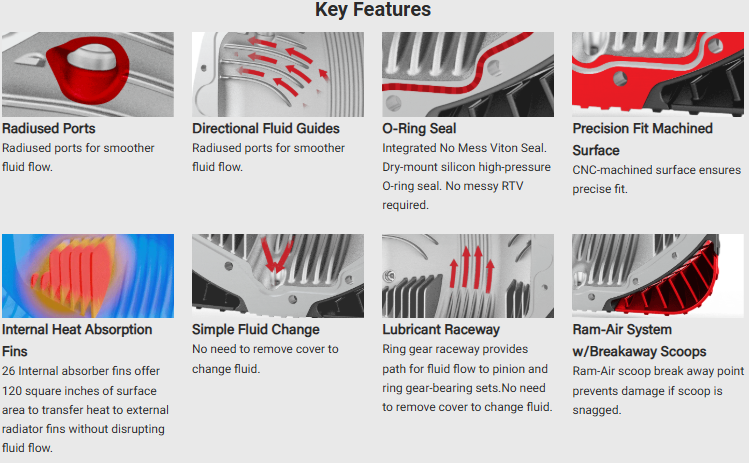 Our patented Ram-Air scoops are designed to increase airflow over the rear differential without sacrificing ground clearance. In fact, our differential cover retains the same low point as factory and competitors.