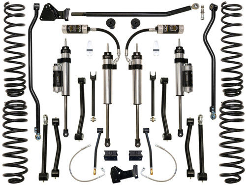 The ICON Stage 4 Jeep JK 4.5" suspension system includes dual-rate coil springs, track bar drop brackets, high-steering components, bump stop spacers, rear brake lines, rear sway bar links, complete set of front and rear links, and 2.5 Aluminum Series reservoir shocks w/ CDCV. Tested and tuned, the ICON JK Stage 4 suspension system offers stability and drivability over a wide range of off-road terrains, while keeping a smooth on road feel for every day driving. This system includes 2.5" remote reservoir shocks front and rear to ensure optimum performance by increasing the duration of consistent damping regardless of situation, keeping the shocks at a cooler operating temperature during heavy use. The ICON CDC Valve upgrade is included in this stage for those desiring an easy way to tune the ride externally. Installing this kit allows proper clearance for 35" tall tires with no modifications and 37" tires with aftermarket high clearance fenders.