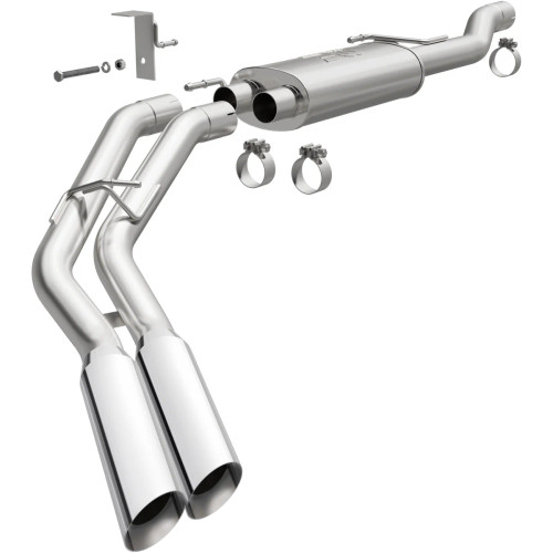 The MagnaFlow Street Series Cat-Back Performance Exhaust System 16868 brings out the personality of your Truck with our signature resonant, powerful engine tone and dyno-proven performance. Thanks to its fast-flowing, mandrel bent 3in. main piping and 1 Straight-Through mufflers ending in a Dual Same Side Before Passenger Rear Tire exit with 3.5in. Polished Welded-On Single Wall Angle Cut Edge tips, this Truck exhaust kit has the performance chops to match its sporty sound and appearance. Upgrade your ride to the next level with an exhaust that has the pipes to put other Truck's to shame. With this system your vehicle will be producing Very Aggressive exterior and Aggressive interior sound levels while leaving other cars and trucks feeling envious at every stoplight. Exhaust kit 16868 features a cat-back layout that replaces your ride's stock exhaust components from near the catalytic converter on back. Extensive 3D scanning during development has resulted in a direct-fit design that you can easily install yourself. 16868 is produced using CNC precision robotic manufacturing techniques and is backed by MagnaFlow's 1-year limited finish warranty and limited lifetime construction warranty.