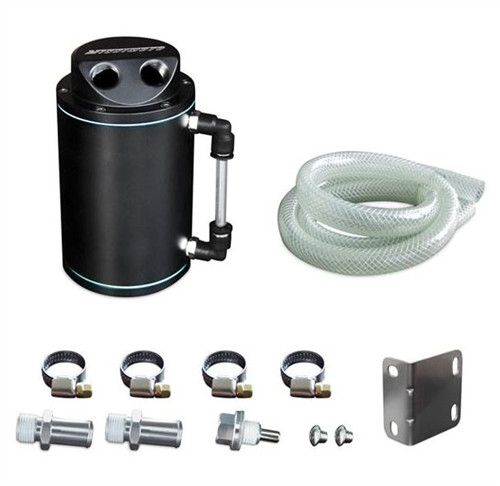 Mishimoto has developed an oil catch can to make sure you're getting the most out of your performance parts. Over time harmful oil will build up inside the turbocharger, intake manifold, intercooler and piping. A Mishimoto Oil Catch Can will prevent this from happening while It's all black finish will add a touch of style to your engine bay. An oil catch can serves other important purposes as well. It will prevent oil from getting into pressurized turbo plumbing, which can lead to couplers coming off under boost. Oil vapors can get into the intake system which will lower combustion temperatures and reduce overall efficiency. A Mishimoto Oil Catch Can will solve all these problems and give you the added security knowing that your performance parts are safe from harmful oil.
