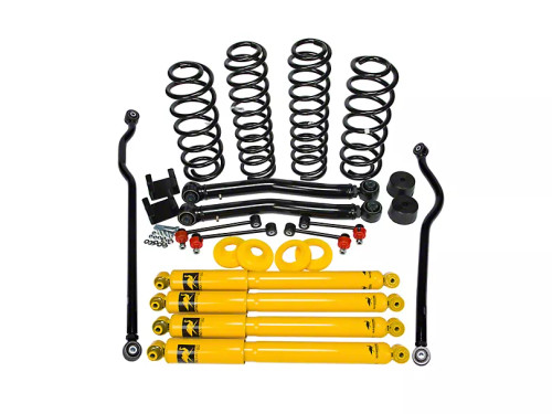 Includes coil springs, shocks, front lower control arms, front and rear track bars, bump stop kit, sway bar links, and trim packers.